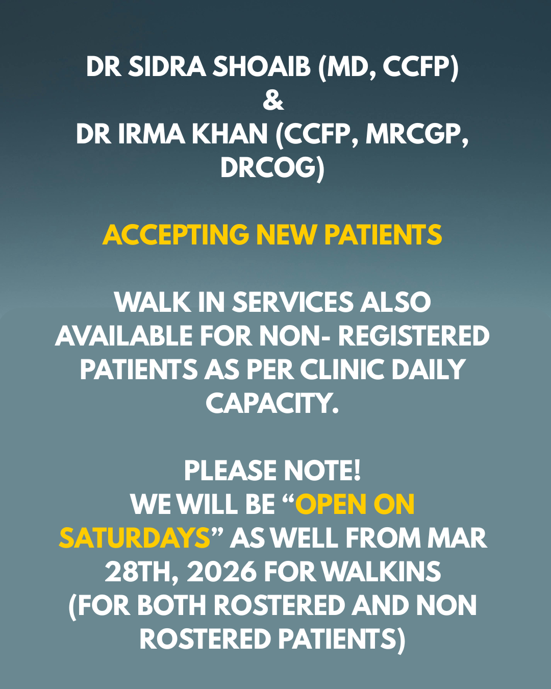 Dr. Khan’s practice is centered on providing compassionate and comprehensive family medical care for both individuals and families. Her clinic operates as a Family & Walk-In Practice, ensuring that patients have flexible access to healthcare when they need it most.